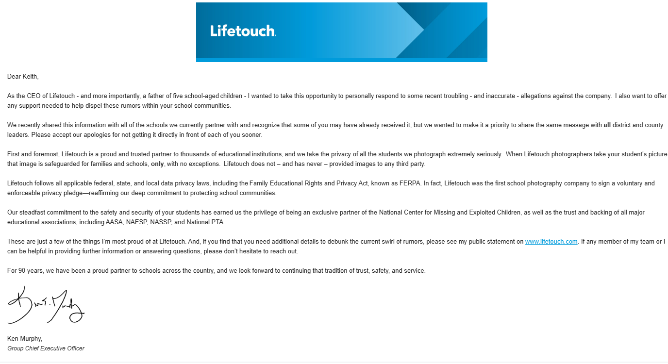 Out of an abundance of transparency, the CEO of Lifetouch Ken Murphy shared a letter with KFCS Superintendent Keith Brown of Klamath Falls City Schools addressing these allegations. We are sharing Lifetouch’s official response with our families so you have direct access to their statement. |