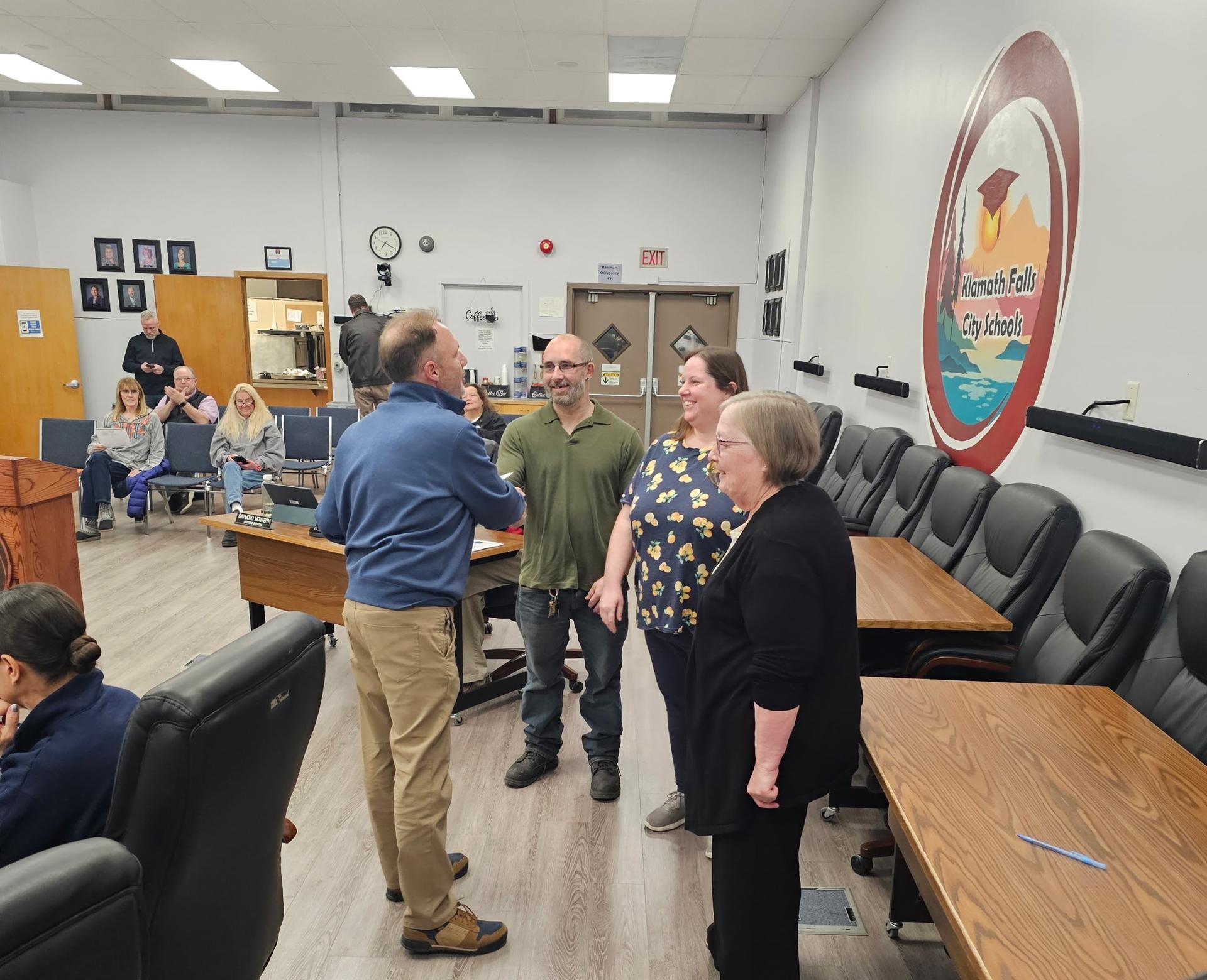 At this past Monday's Klamath Falls City Schools Board of Education monthly meeting, three new budget committee members were sworn in. KFCS Board of Education Chair Andrew Biggs welcomed the new committee members (from left to right): Ethan DuBois, Jaynee Coslet and Robin Gray. |