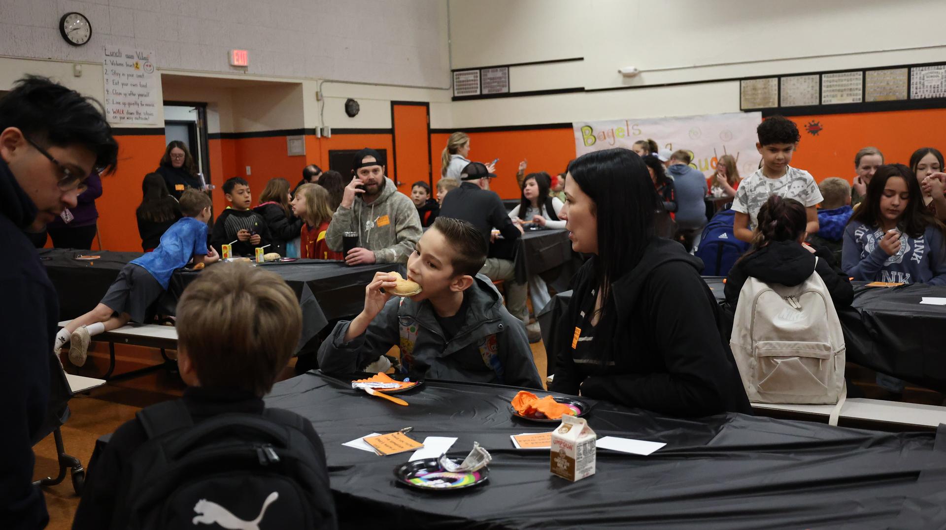 Held in the school auditorium, the celebration invited students to bring a parent or guardian to enjoy breakfast together. Families shared an assortment of bagels, cream cheese, and juice while recognizing the teamwork it takes to maintain strong attendance.