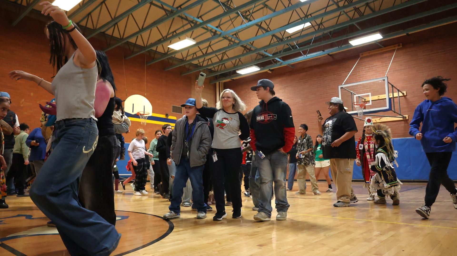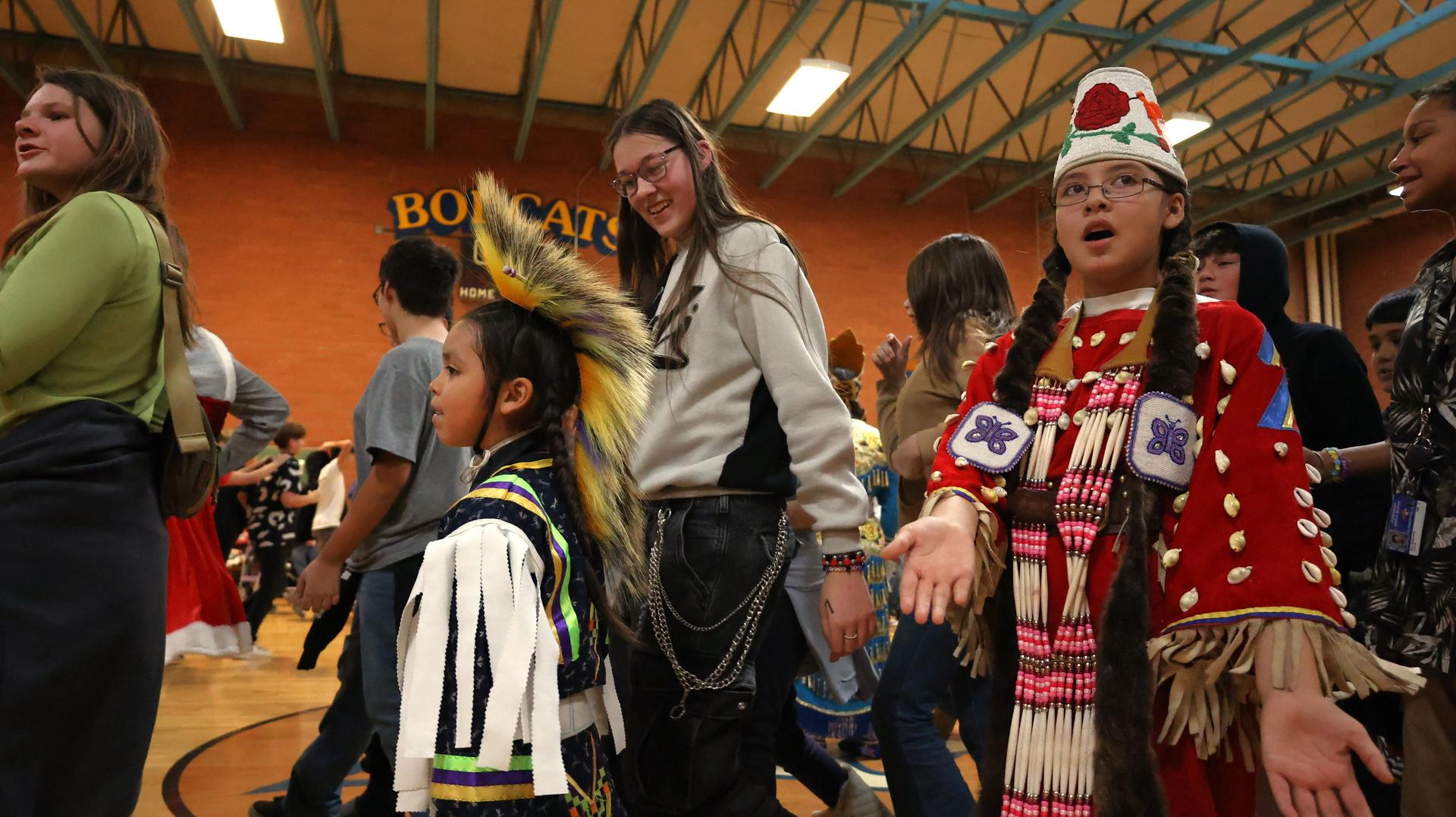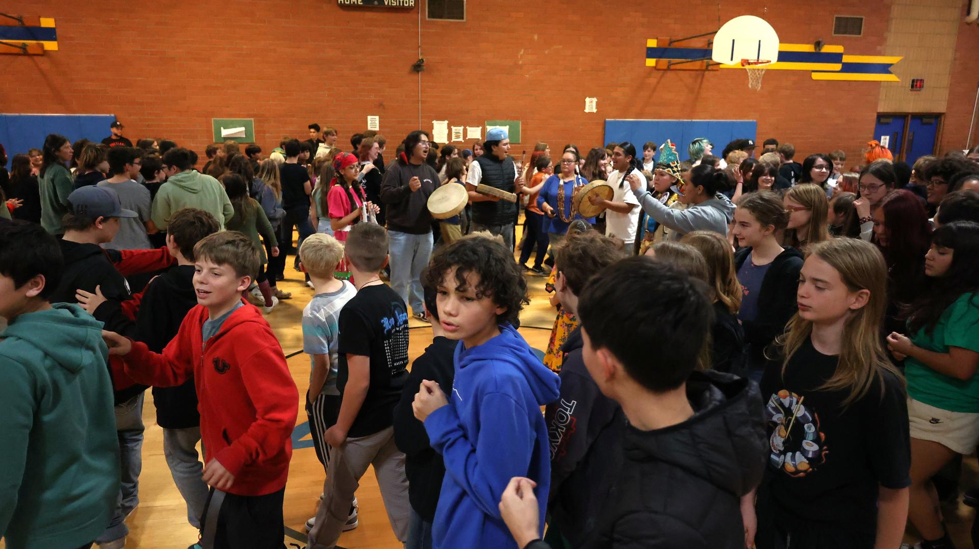 Ponderosa Middle School students were treated to a lively and meaningful cultural assembly Monday as members of the Wocus Boyz shared traditional Native dances, teachings and songs.
